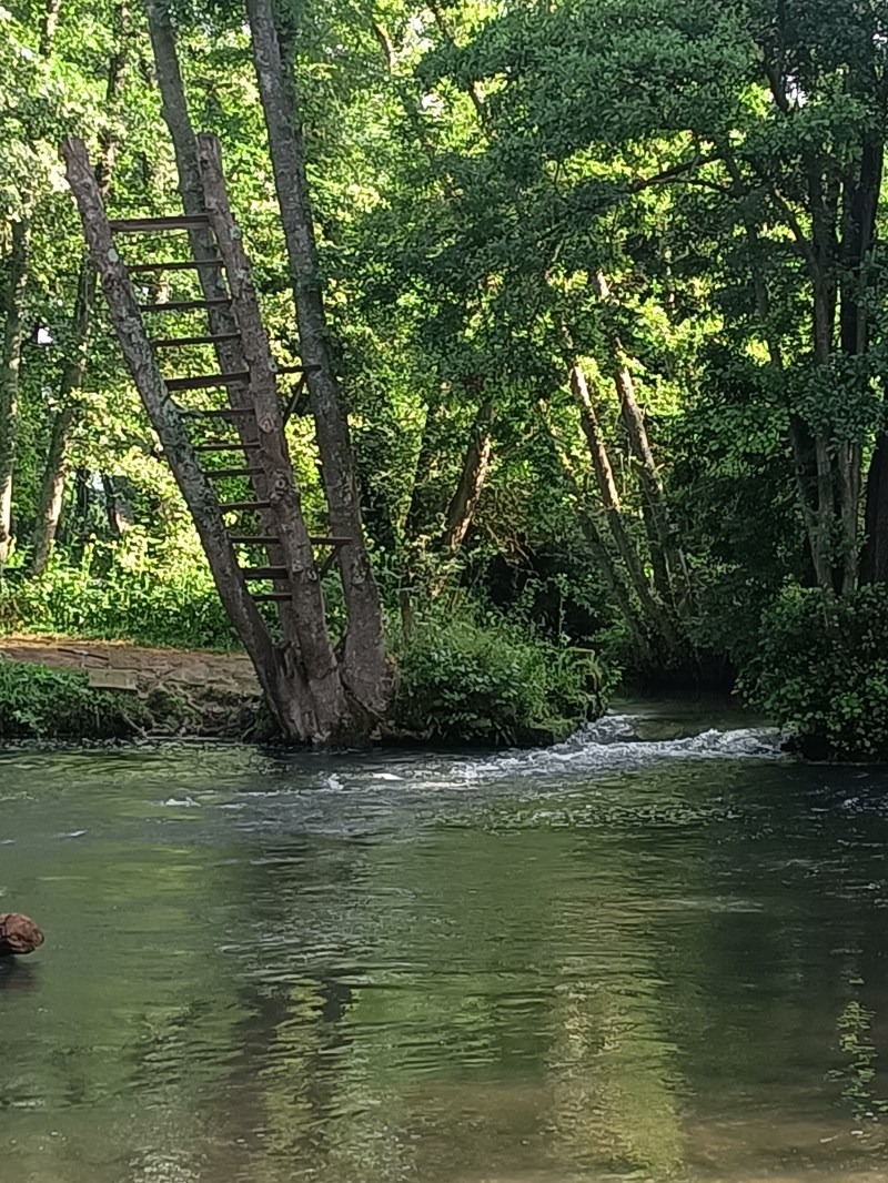 Curieux équipement, vu la profondeur de l’eau, il ne peut s’agir d’un plongeoir, on ne distingue pas sur la photo, mais il y a une corde accrochée au sommet avec une poignée en bas, qui pourrait servir à se balancer façon Tarzan…