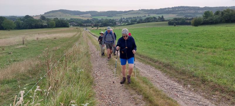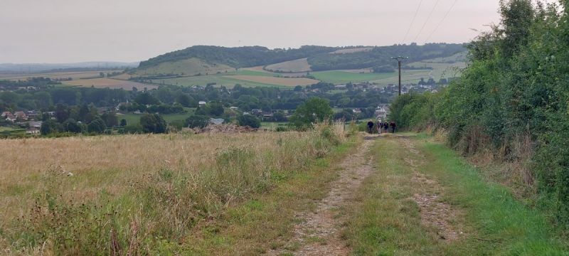 Au loin sur la gauche, la « Boutonnière du Pays de Bray », en face le « Mont St Hélène », et les petites silhouettes, nos marcheurs d’Élan.