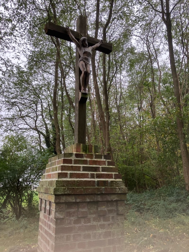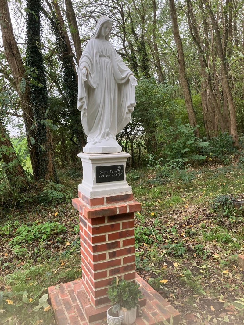 Sur un chemin, entre deux champs, et très loin d’habitations, plusieurs monuments religieux nous ont questionnés : Christ et Vierge. On aimerait en connaître davantage sur la raison de cette implantation au milieu de nulle part.