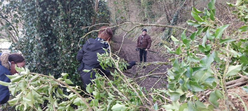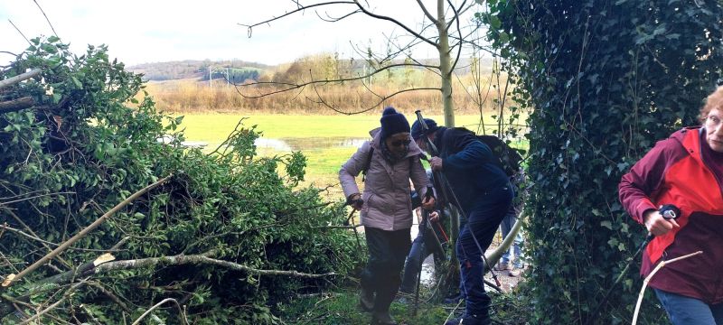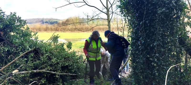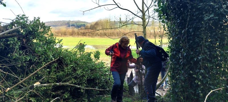 Un arbre couché par la tempête sans doute fragilisé par un sol détrempé ! nous bloque le chemin, il va falloir passer en enjambant les nombreuses branches cassées, ce n’est pas aisé.