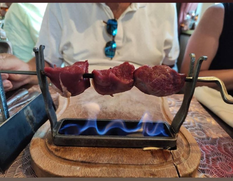 Spécialité de ce restaurant : Le barbecue médiéval, la flamme est produite par le Calvados qui cuit la viande