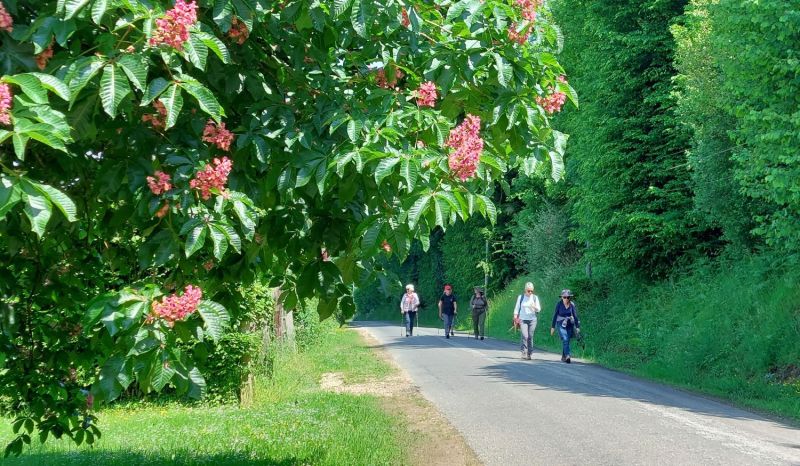 Une première photo avec un magnifique Marronnier rose au premier plan et de charmantes Marcheuses d’Elan.