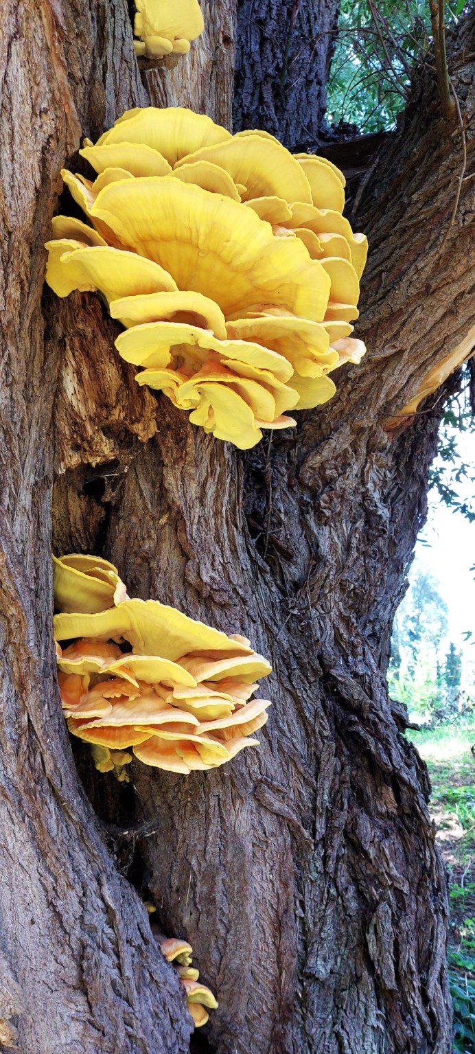 Le « Polypore soufré » ou champignon poulet, toxique cru mais délicieux cuit au goût de poulet, attention le sujet doit être jeune pour être dégusté.