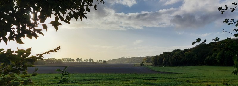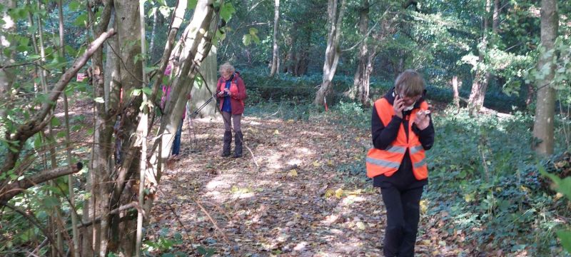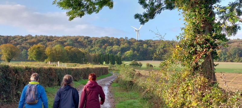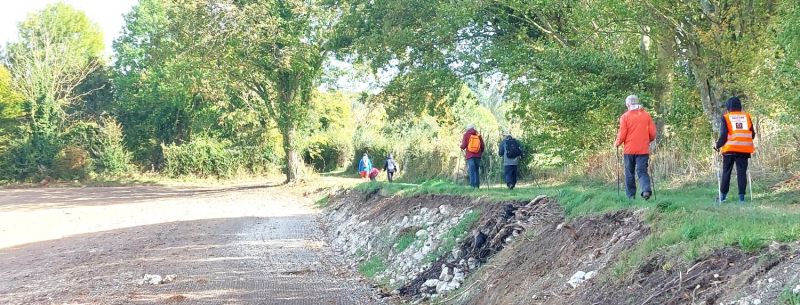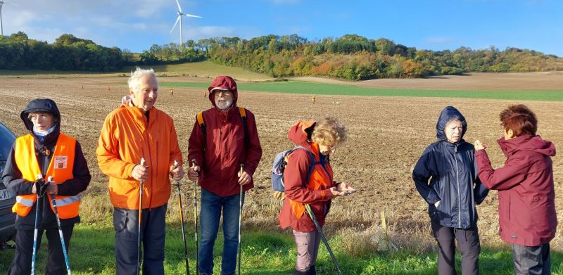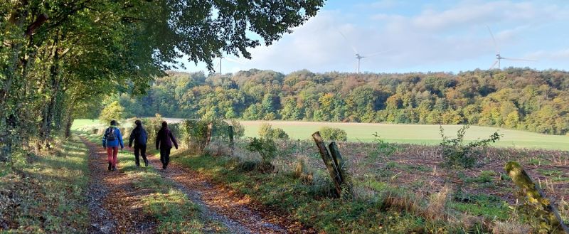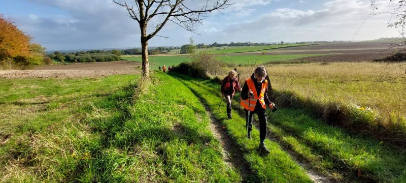 Allez Josiane et Françoise, on pousse sur les bâtons, si possible, levez la tête, juste pour la photo. Au passage admirons les couleurs automnales, le tapis vert et sur la gauche le feuillage jaune-orangé, au fond les champs labourés.